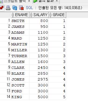 --급여 등급 테이블(SALGRADE)의 낮은 등급(LOSAL) ~ 높은 등급(HISAL)
