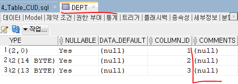 테이블 열에서 컬럼 주석을 확인 할 수 있는데 지금은 아무것도 없다.