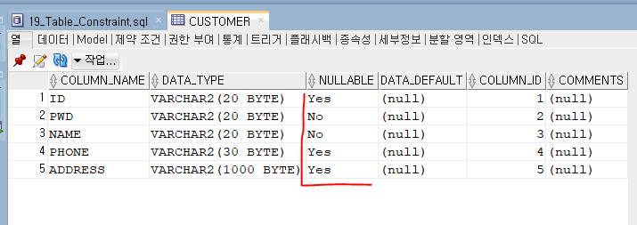 NOT NULL은 여기서도 확인이 가능하다. 기본적으로 NOT NULL을 하지 않으면 NULLABLE은 YES이다.