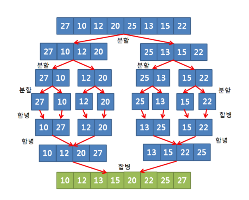 1개의 리스트를 2개의 균등한 크기로 분할하고 분할된 리스트를 정렬한다음, 2개의 정렬된 부분을 합쳐서 전체가 정렬되게 하는 방법