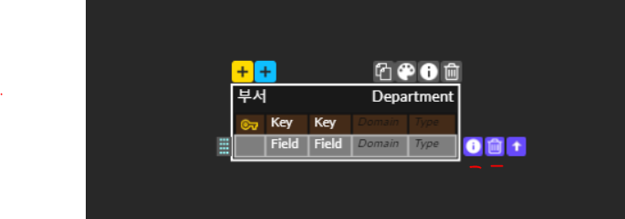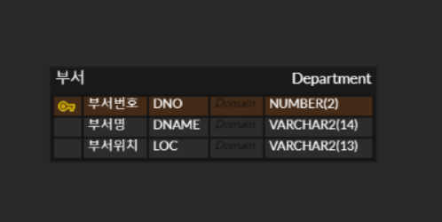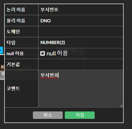 부서 정보 테이블의 엔티티를 만들었다. 엔티티는 행이 컬럼의 정보이므로 행이 컬럼의 갯수와 같아야한다.