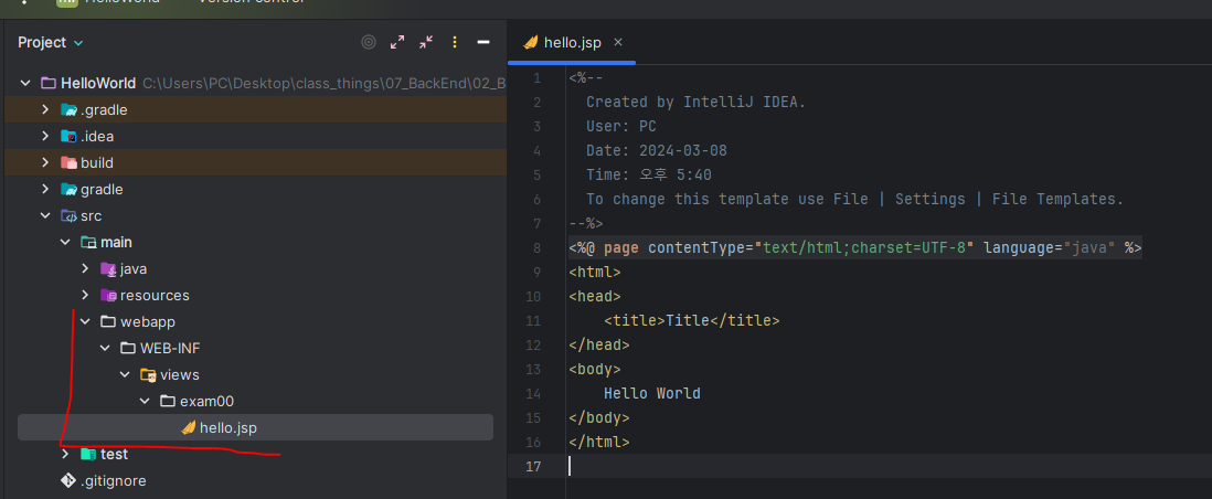 위와 같은 경로를 만들면 jsp파일이 생기고, jsp는 다음과 같이 생겼다.