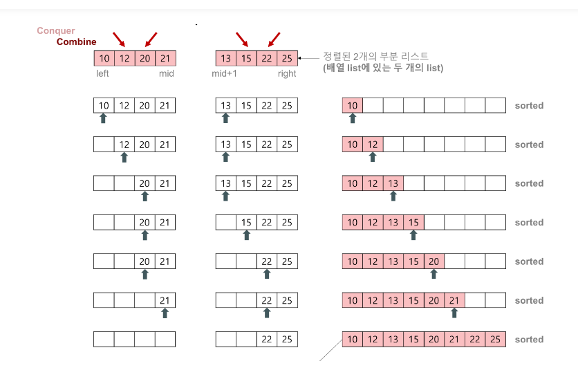 (3) 정렬된 부분리스트들을 하나씩 합병한다.