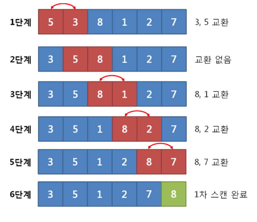 인접한 2개의 숫자를 비교하여 크기가 정렬되지 않으면 오름차순 정렬하면서 배열의 끝까지 이동시키는 알고리즘
