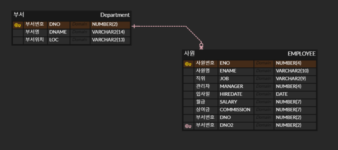 참조키(외래키 FK)로 관계설정을 해야한다. 사원들은 기본적으로 부서에 소속이 되어있다. 부서와 사원을 연결해주는 공통된 컬럼을 참조키라고 하고 이건 부서번호가 된다.