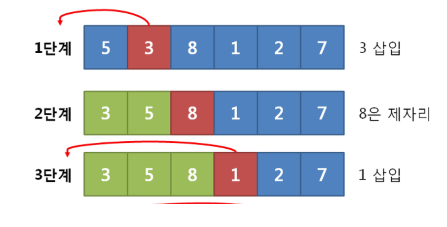 (2) 3번째 숫자를 이전 배열과 하나씩 비교해서 작으면 그 숫자 앞에 끼워넣음