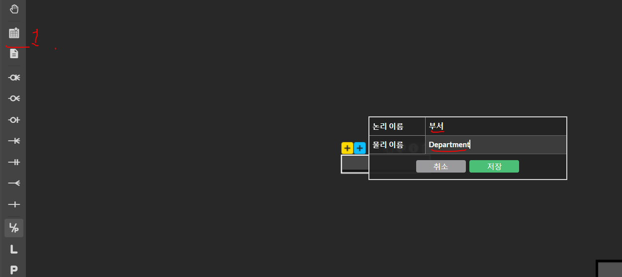 1번을 누르면 새로운 엔티티가 만들어진다. 여기서 "!"를 클릭하면 다음과같은 이름을 적는 창이 뜨는데 논리이름은 보통 한글을 적고 물리이름은 보통 영어로 적는다.