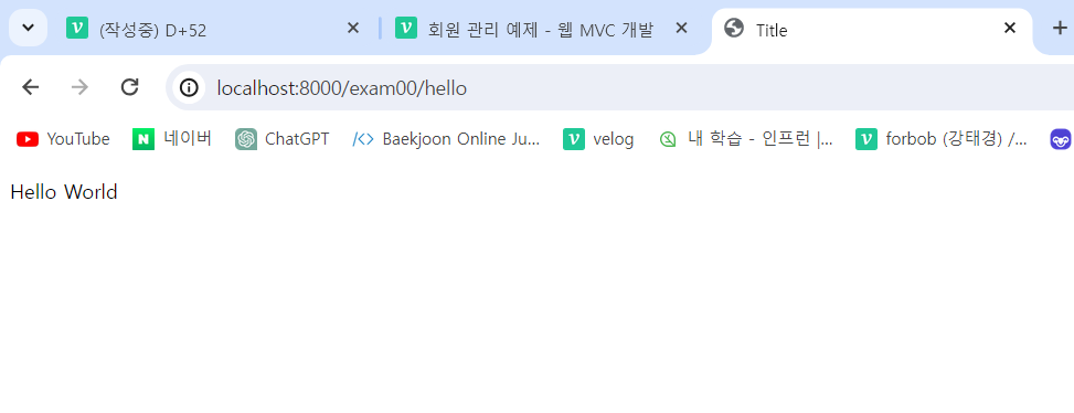 @GetMapping을 통해 연결을 시켜준다. 이 뒤에 오는 exam00/hello을 주소창에 입력하면 return에 있는 경로의 html 파일이 실행되는 원리이다.