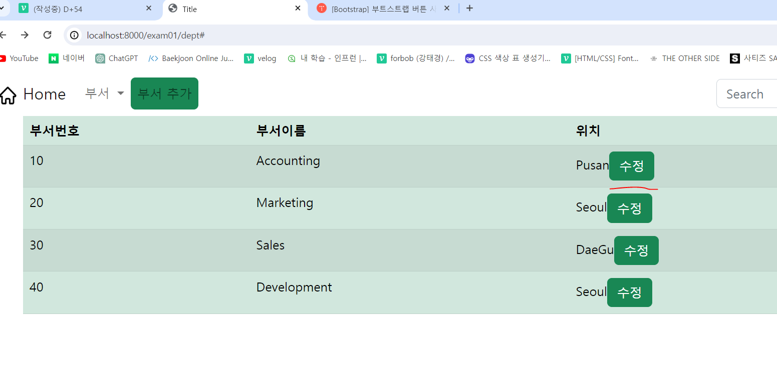 header의 드롭다운 부분인데 여기에 각각 /exam01/dept/{dno}를 적어주어 연결을 해주었다.