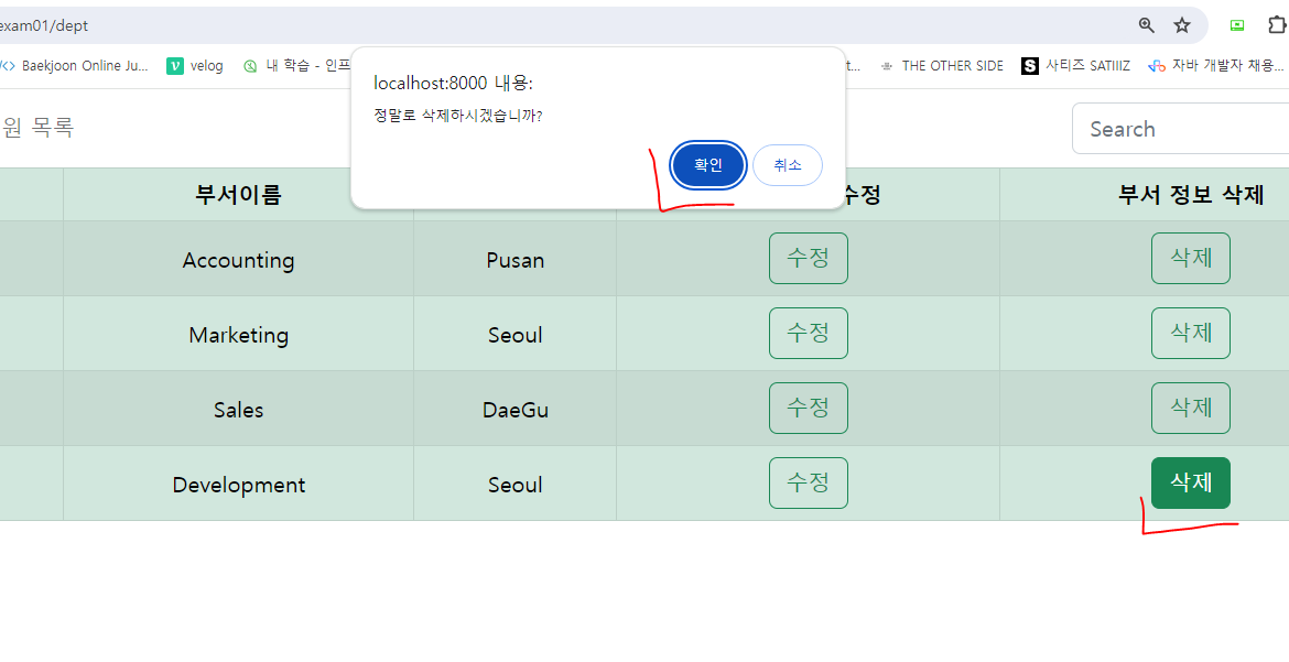 삭제버튼을 누르면 다음과 같이 메세지가 뜨고 확인 버튼을 누르면 삭제가 된다.