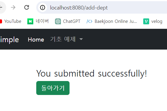 저장 버튼을 누르면 saveDept가 실행되어 값이 백엔드로 넘어가고 submitted는true로 바껴 돌아가기 버튼이 나오게 된다.