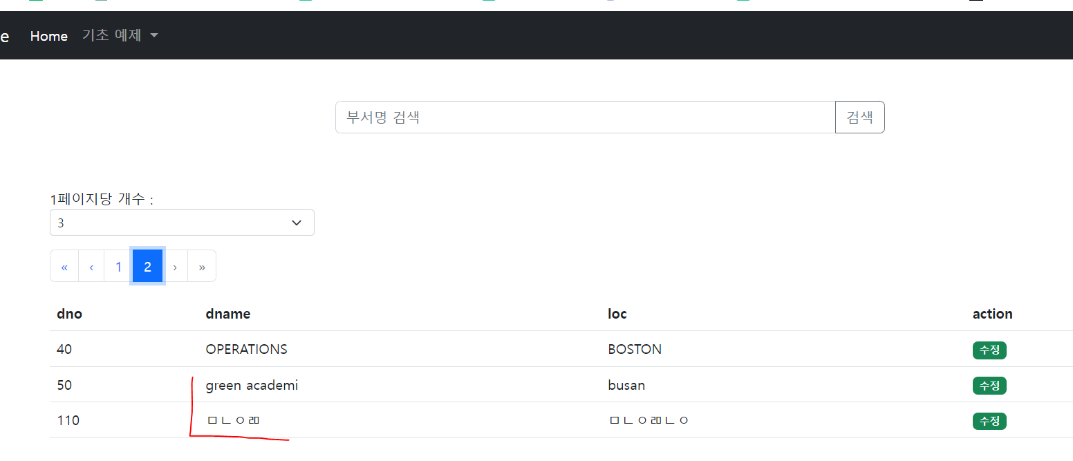 해당 dno의 값을 update해야하므로 dno를 변수로 받고, 받은 dept로 수정을 해야하므로 dept를 변수로 뱓는다. 그리고 예외처리로 저장이 잘 되면 ok 사인을 보내고 잘 안되면 에러메세지를 보냈다.