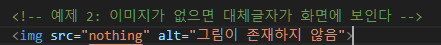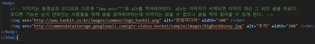 이미지는 동영상과 오디오와 다르게 "ima src="""과 alt를 적어줘야한다. alt는 이미지가 삭제되면 이미지 대신 그 뒤의 글을 띄운다.