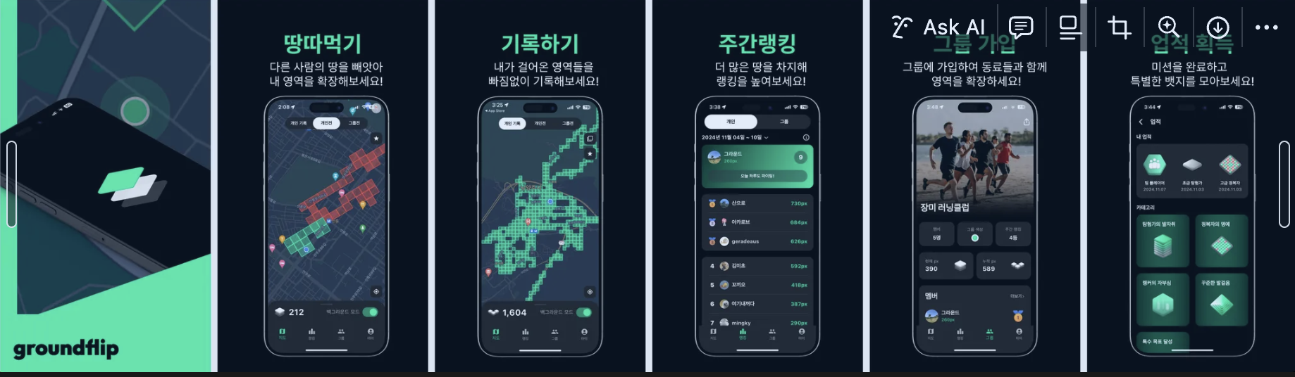 그라운드 플립”은 위치 기반 데이터와 사용자의 걸음 수를 결합한 게임형 만보기 앱으로, 사용자가 실시간으로 땅을 점령하며 활동 데이터를 시각적으로 확인할 수 있는 프로젝트였다. 나아가 AWS 인프라를 직접 설계하고, 대규모 Geo 데이터 최적화를 고민하며 다양한 인프라와 백엔드 기술들을 다뤄볼 수 있었다.