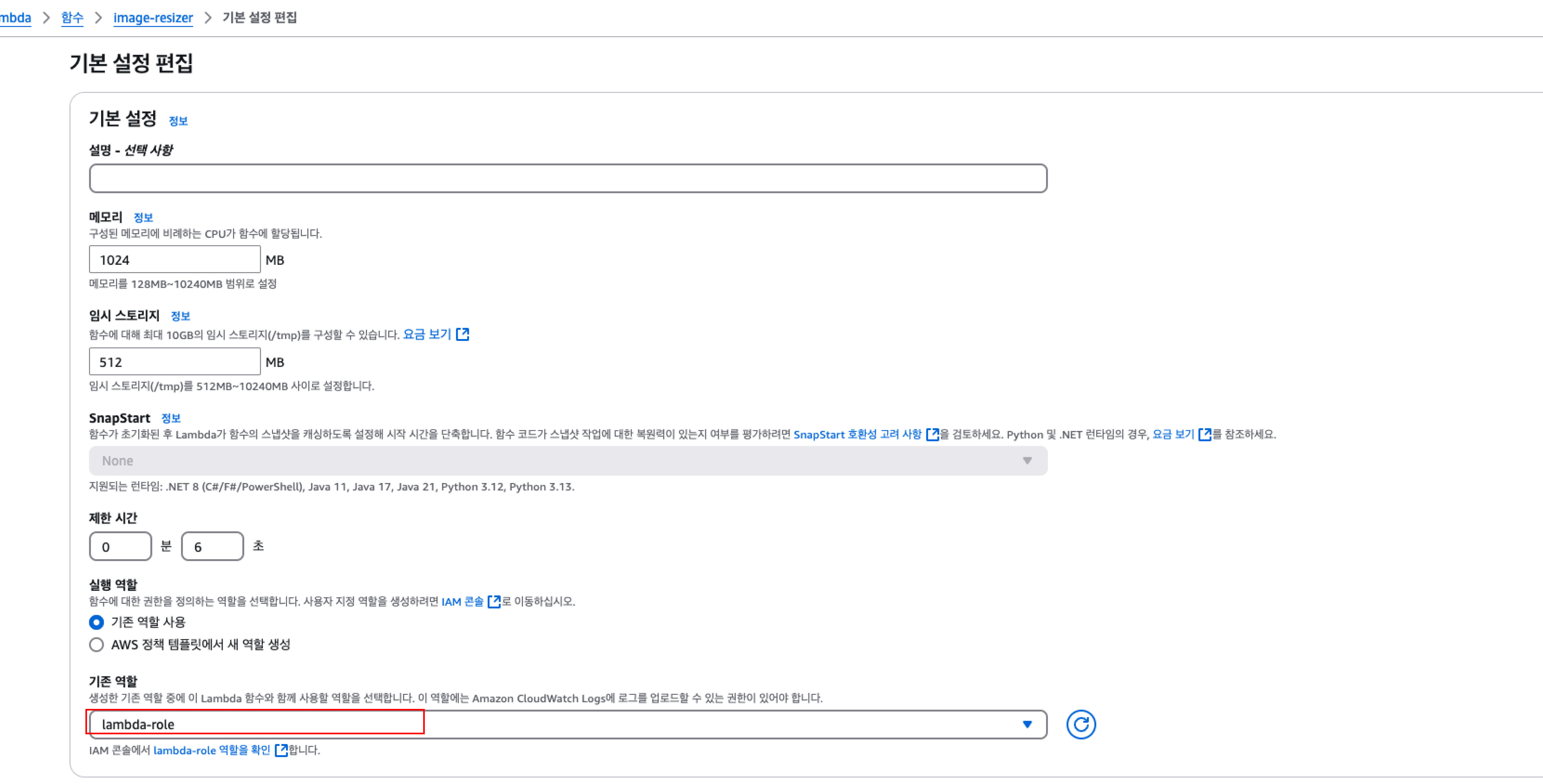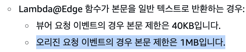 또 잘 보면 resizing한 이미지의 크기가 1048576바이트를 넘기는 경우 에러를 발생시키는데 이는 Lamgda@Edge의 제한사항 때문이다
