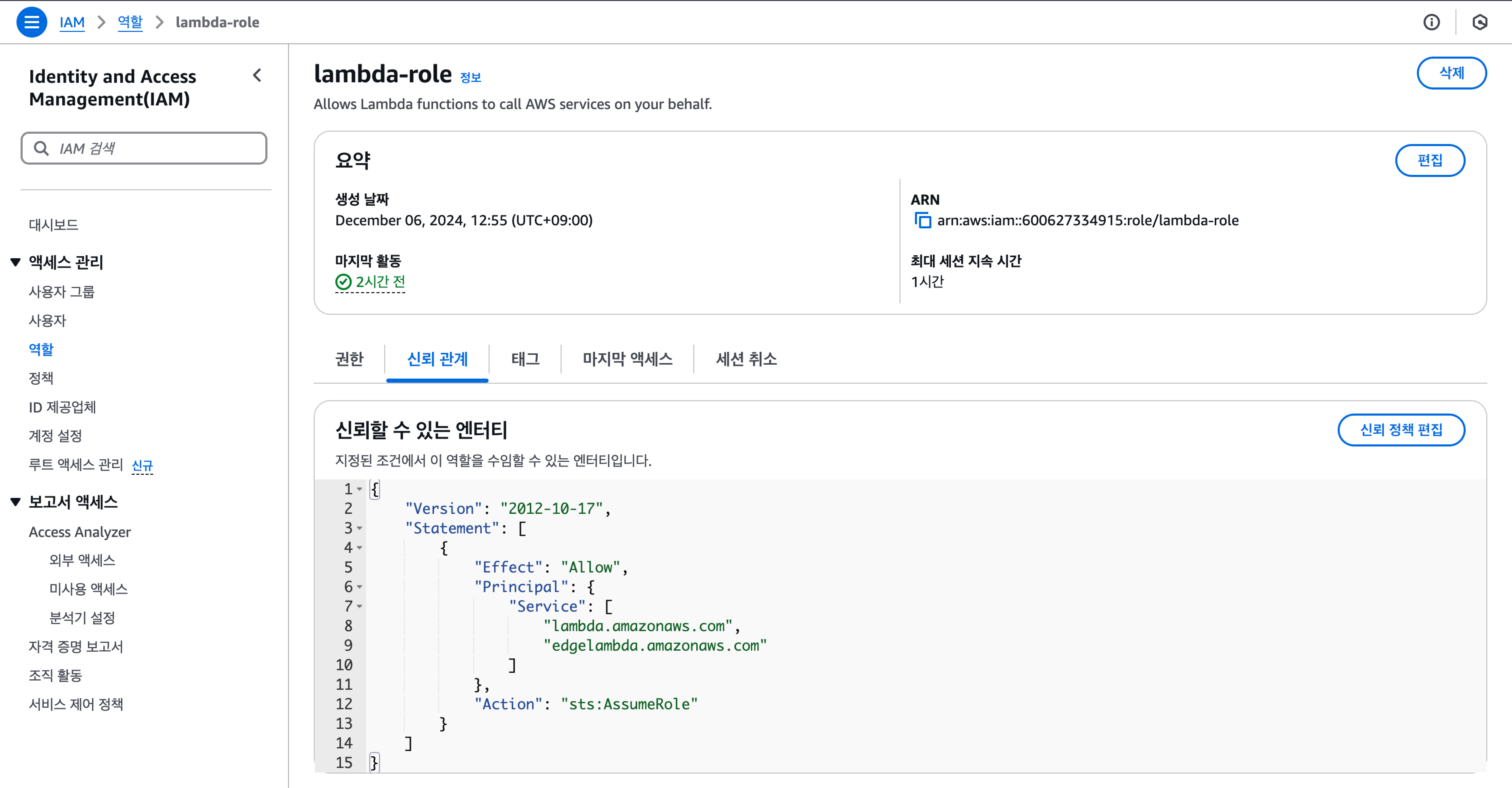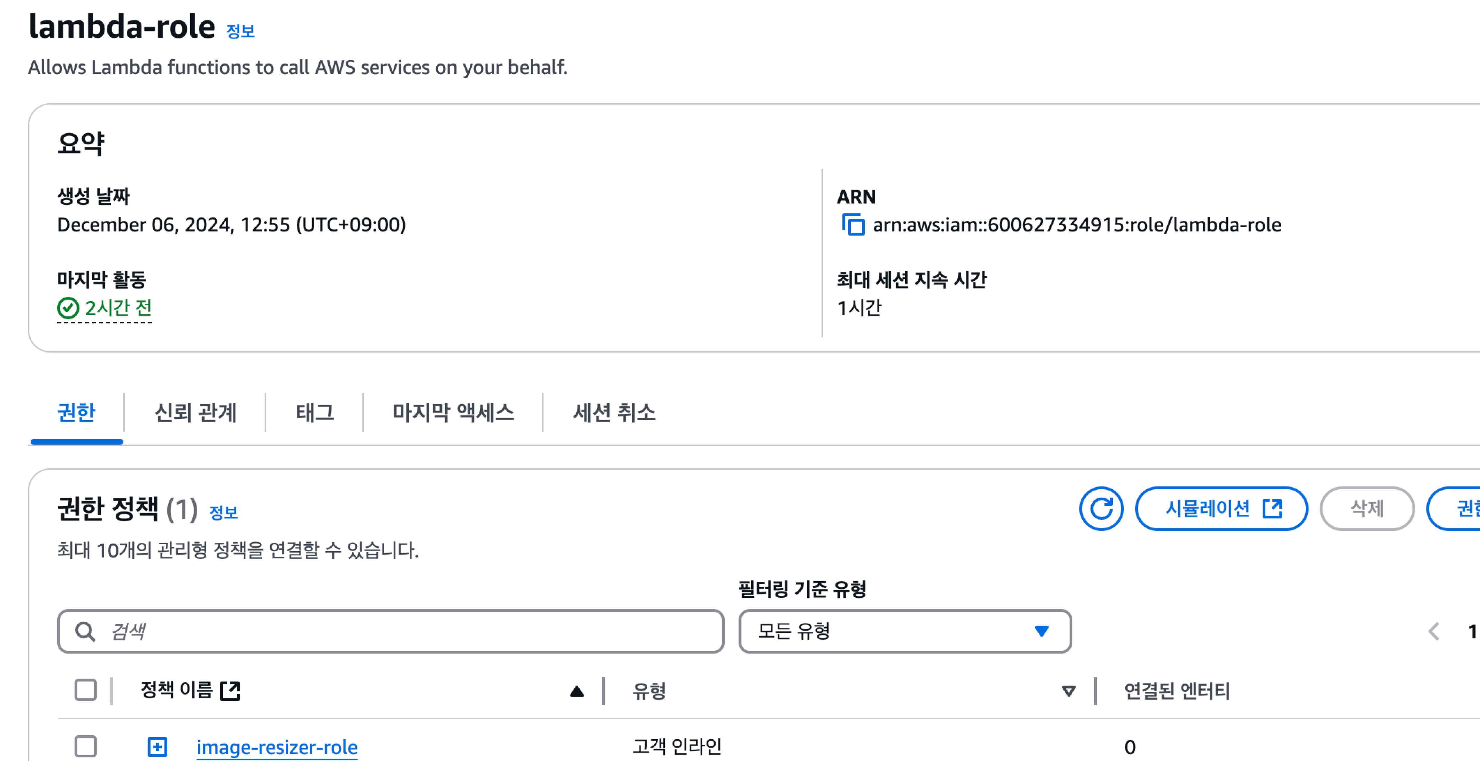 객체에 대한 조회 권한과 lambda의 함수 접근 권한, edge location에 함수를 전달하기 위한 복사 권한이 보인다