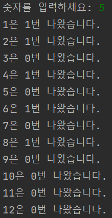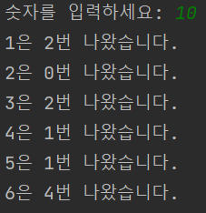 System.out.printf("%d은 %d번 나왔습니다.\n", i, counts[i]);