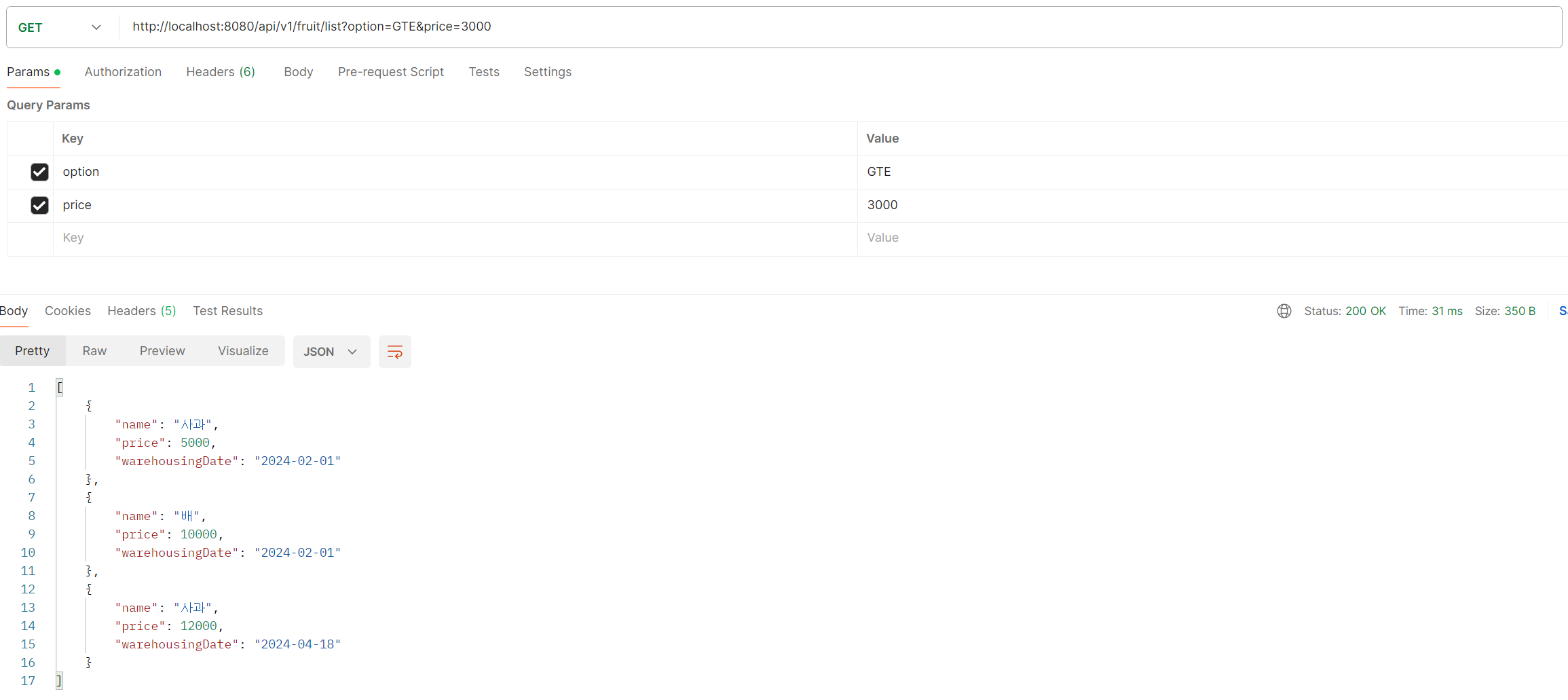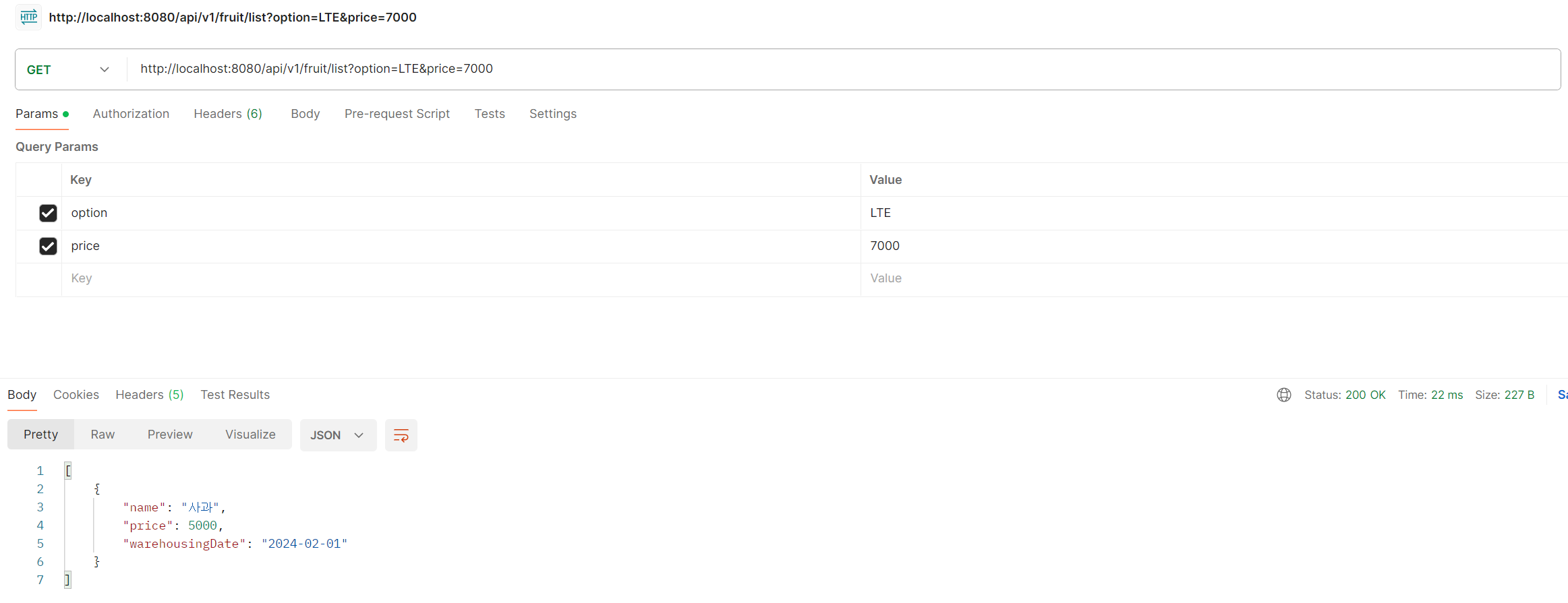 public List<FruitListResponse> getFruitsByPrice(@RequestParam String option, @RequestParam long price) {