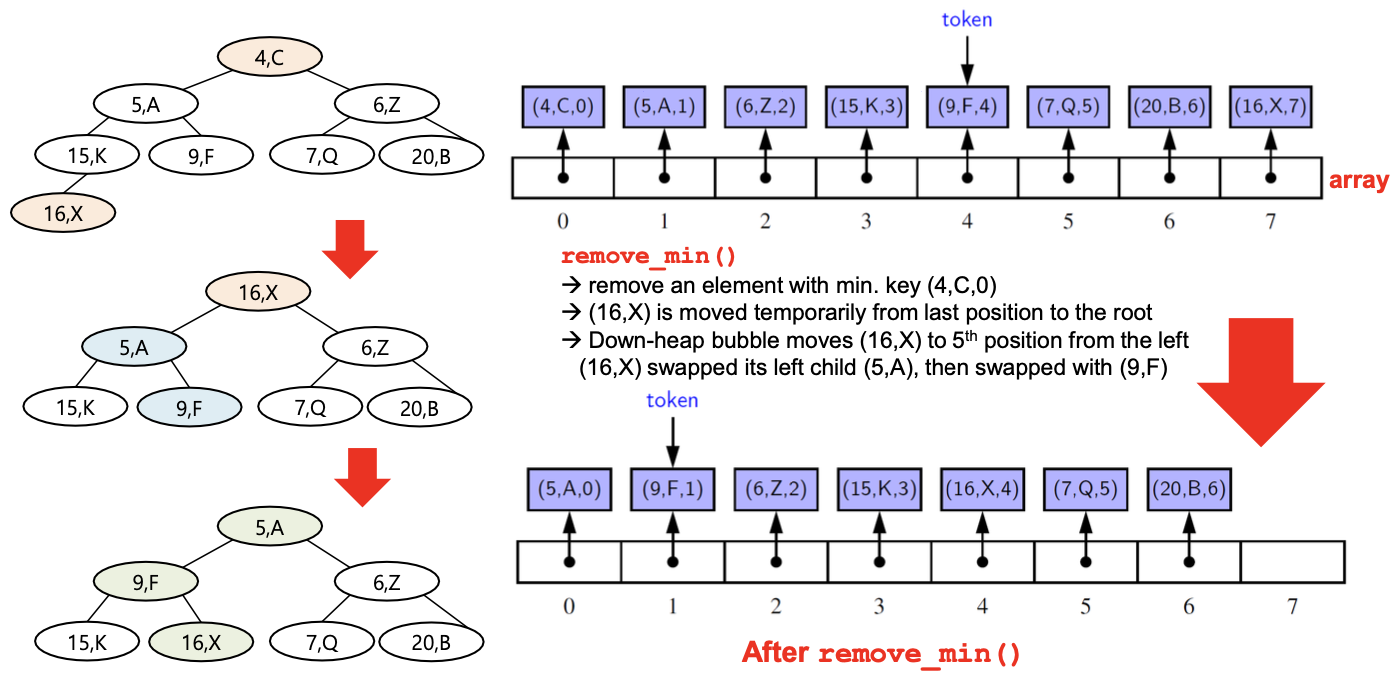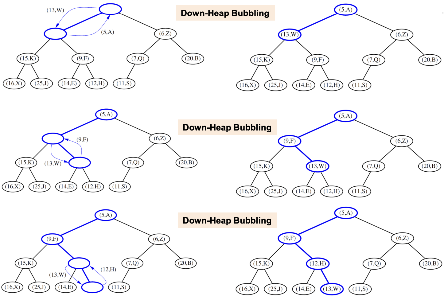 - down heap bubbling : Min Heap일 경우, 변경된 root node의 entry키가 parent보다 클때까지 swap 진행