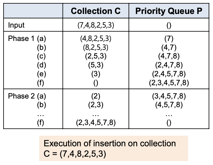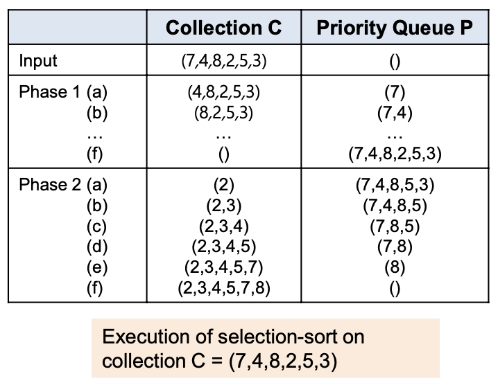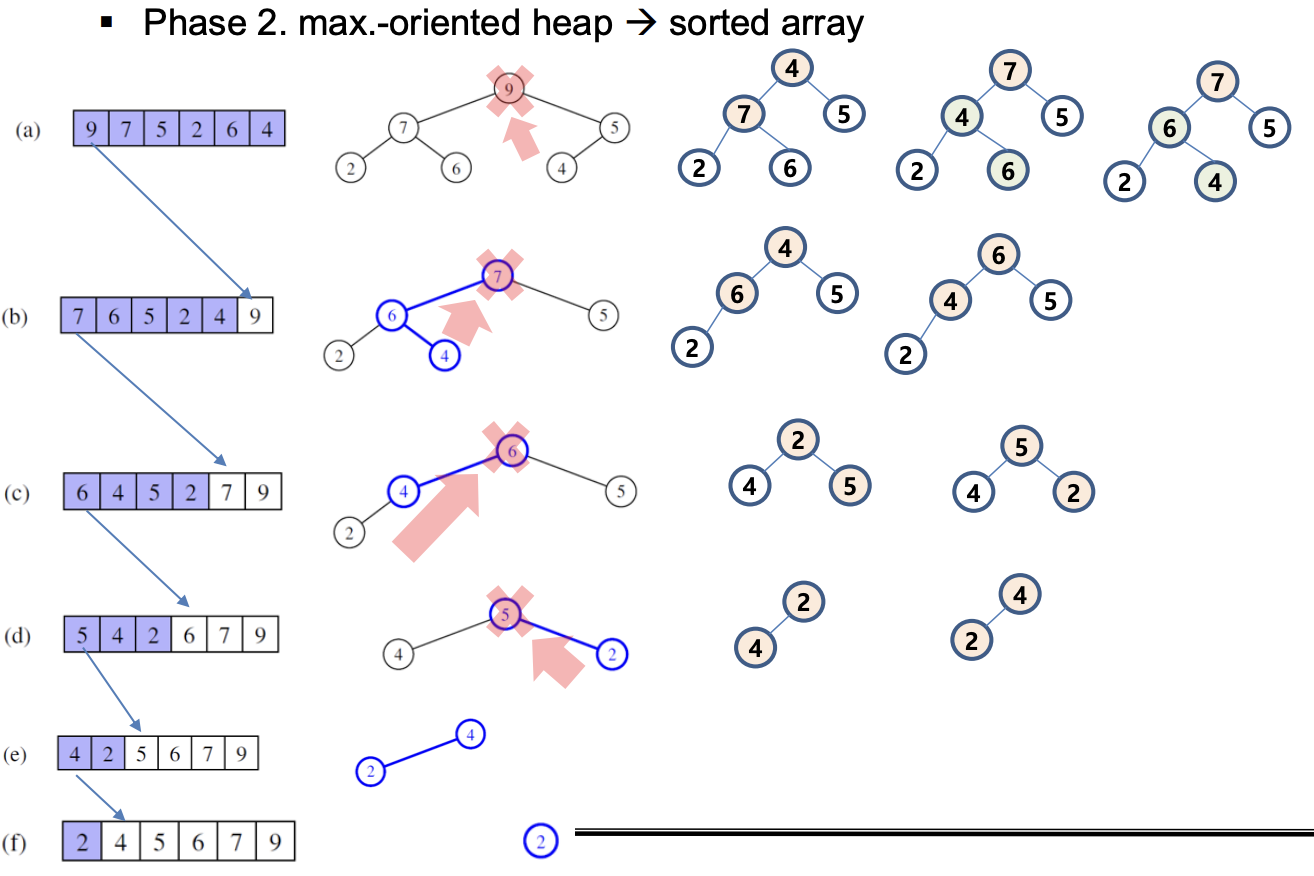 - sequence에서 removeMin을 전체 값의 개수 n만큼 반복, 이 값들을 순서대로 기존 sequence에 옮김