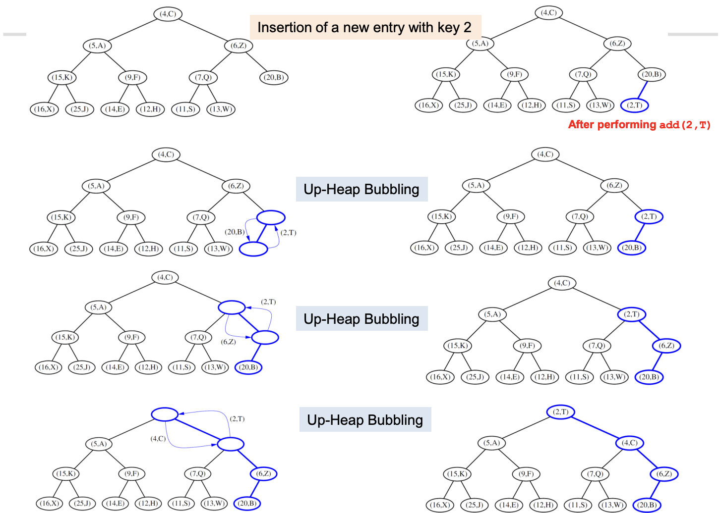 - up heap bubbling : Min Heap일 경우, 추가된 last node의 entry키가 parent보다 작을때까지 swap 진행