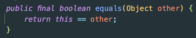 이쯤 물리적인 같음과 논리적인 같음을 구분할 필요가 있는데, 쉽게 나누자면 물리적인 같음을 Identity(동일성), 논리적인 같음을 Equality(동등성)이라 한다. 이걸 Java의 세계로 옮겨오자면, primitive type의 값이 같거나, 객체의 참조값이 같으면 이를 Identity라 하고 일련 번호처럼 논리적으로 같은 경우 Equality라 할 수 있겠다. 잘 아시다시피 모든 객체의 부모 클래스는 Object이고, 따라서 참조값으로 equality를 확인하는 기본 로직은 Object에 정의되어 있다.