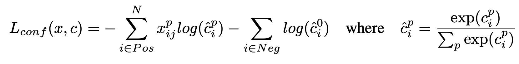 i ∈ Neg는 음성(negative) 샘플, 즉 객체와 매칭되지 않은 디폴트 박스에 대해 계산(예측 박스 i가 객체가 없는 상태(즉, 배경)일 확률을 계산, 음석객체는 객체가 아닌 배경을 예측하도록 학습