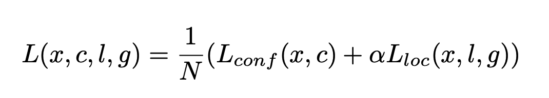 SSD의 학습 목표는, 위에서 설명한 다양한 Box들인 MultiBox에서 유래한 손실함수로, Localization Loss(loc)와 Confidence Loss(conf)의 가중치 합으로 이루어집니다.