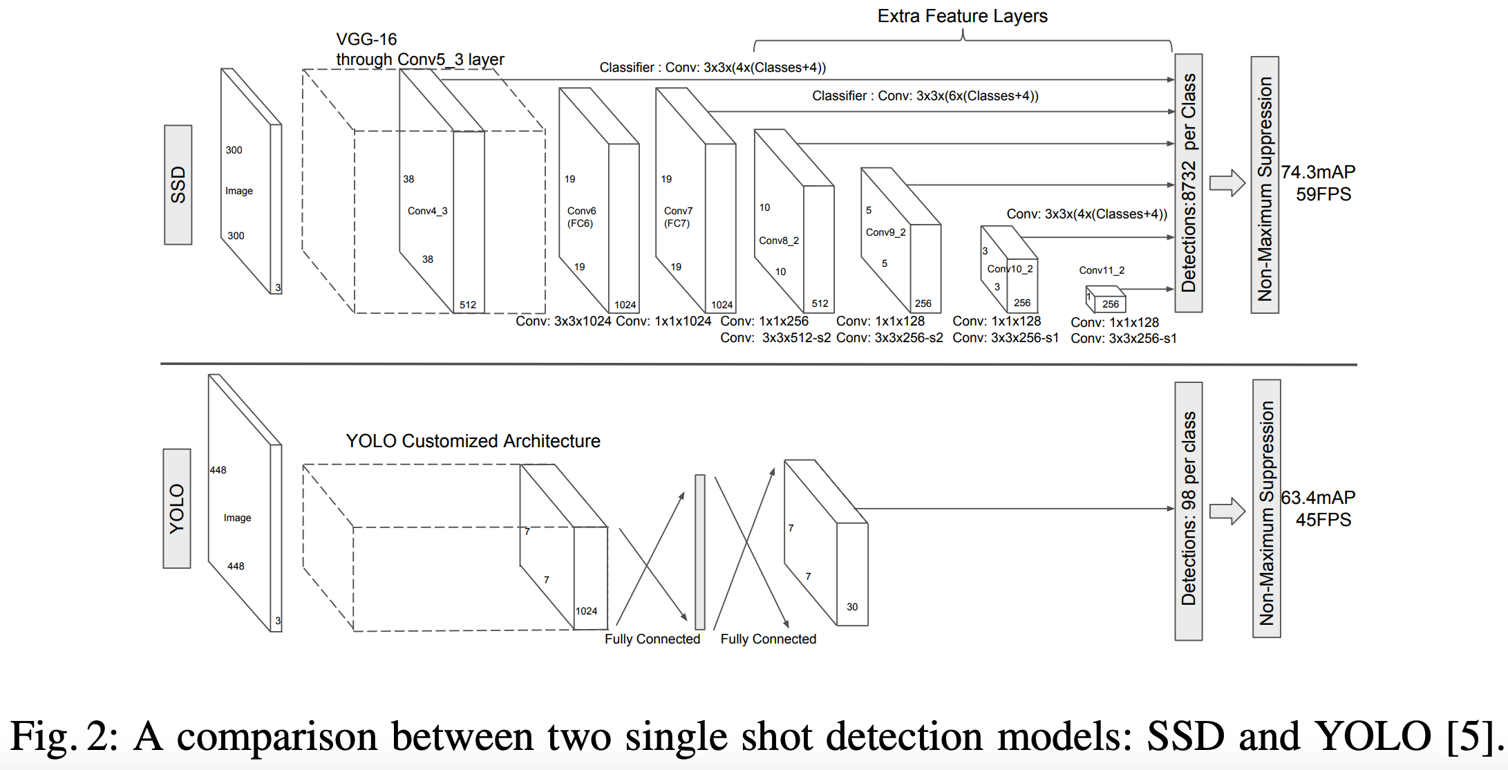 SSD 모델은 YOLO v1 모델과 같게 1-stage detector로 하나의 통합된 네트워크로 detection을 수행합니다. YOLO v1 같은 경우 7X7X30 크기의 feature map만 사용했습니다. 단일한 scale의 feature map을 사용할 경우, 다양한 크기의 객체를 포착하기 여렵다는 단점이 있습니다. 그래서 SSD는 다양한 scale의 feature map을 사용하여 detection을 수행한다는 점이 YOLO v1 과 차이점을 가지고 있습니다.