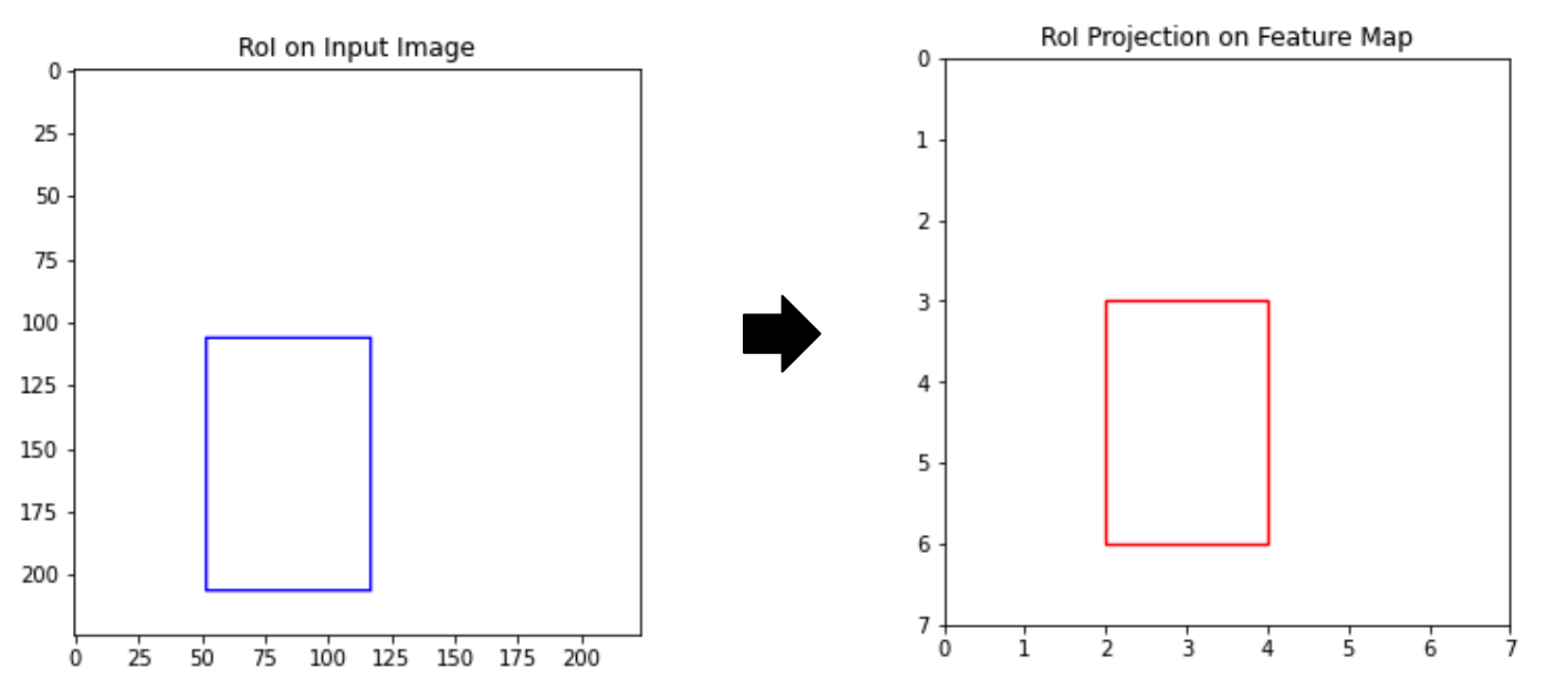 입력이미지 224X224에서 관심 영역 ROI(Region of Interest)이 100X65(좌표:52, 106, 117, 206)이라 할때, 100X65 영역이 그대로 네트워크에 들어가기엔 너무 큰 정보량을 가지고 있어서 ROI Pooling을 통해서 7X7 특징맵으로 변환하고 해당 ROI는 반올림해서 [2, 3, 4, 6] 으로 변환되어 효율적으로 학습
