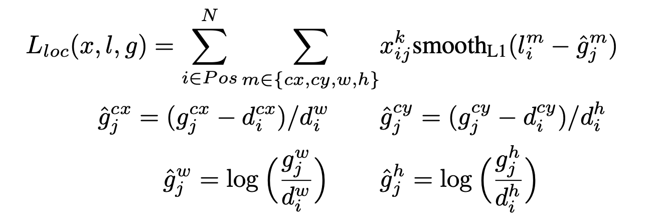 i ∈ Pos는 양성(positive) 샘플, 즉 객체와 매칭된 디폴트 박스에 대해 계산 (예측 박스 i가 실제 객체 j의 클래스 p와 매칭 되었을 때 1인 지표)