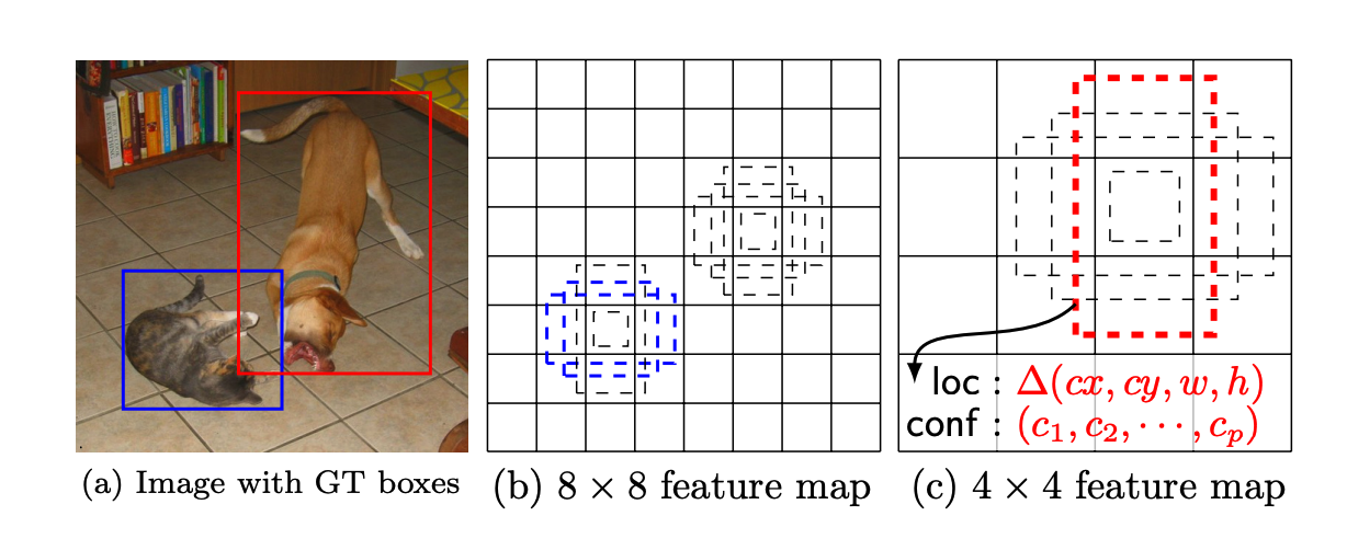 각 feature map들은 다양한 aspect ratios(직사각형의 가로세로 비율: 1, 2, 0.5, 0.333)로 k개의 default bounding box를 생성하고, c 개의 클래스 점수와 default bounding box의 좌표 4개의 값을 계산합니다.