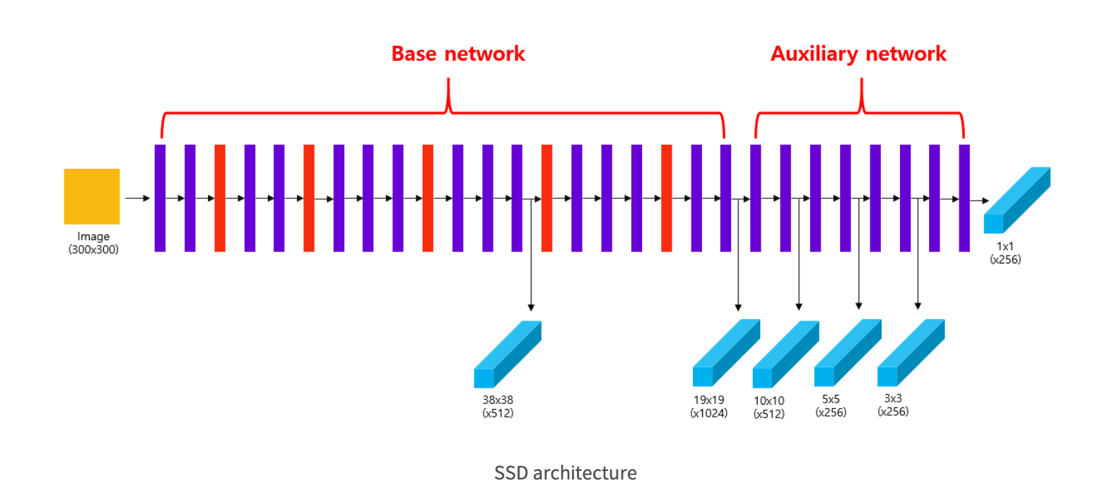 auxiliary network 부분은 conv8_2, conv9_2, conv10_2, conv11_2 layer에서 10X10X512, 5X5X256, 3X3X256, 1X1X256 크기의 feature map을 추출합니다.
