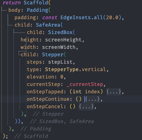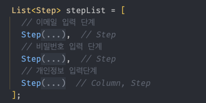이제 Stepper 위젯의 onStepContinue 를 보면, 현재 스텝 인덱스마다 필요한 검증들을 진행하고 다음 스텝으로 넘어가는 것이다.