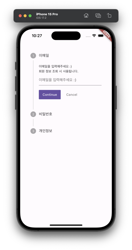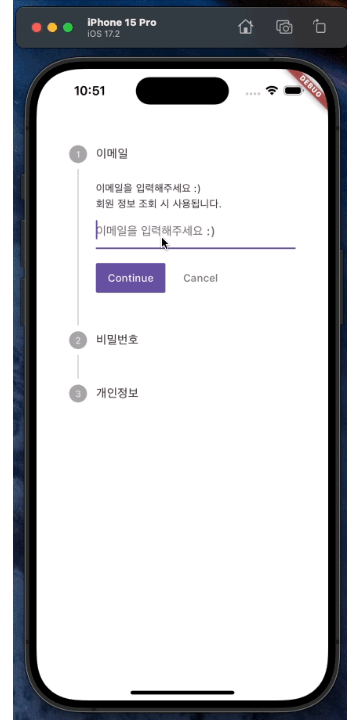 우선 나는 이메일, 비밀번호, 개인정보 입력 단계로 총 3단계로 구성하였다.