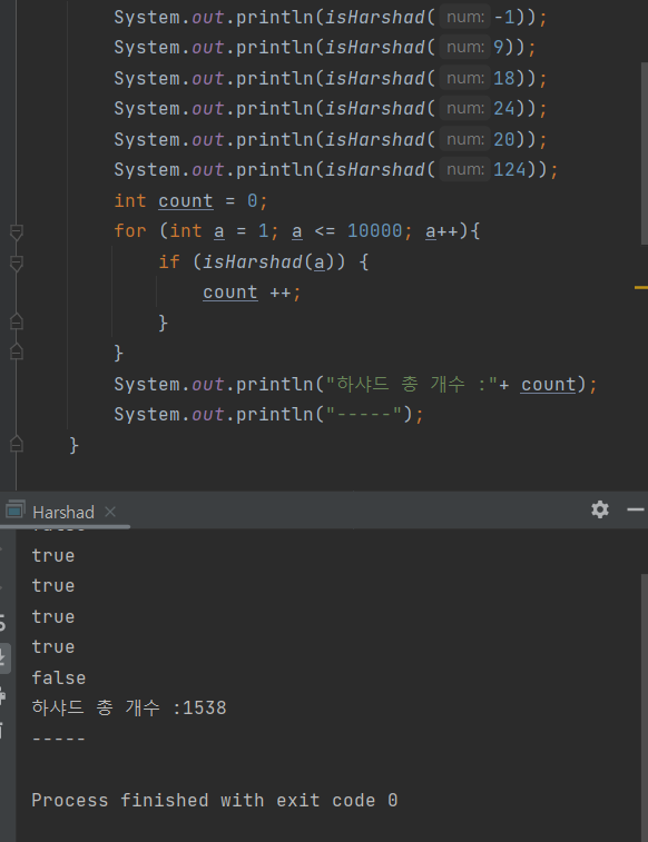 - 1이상, 10000이하의 자연수에 대해 이 수가 하샤드 수인지의 여부를 반환하는 메서드 isHarshad를 완성하시오.