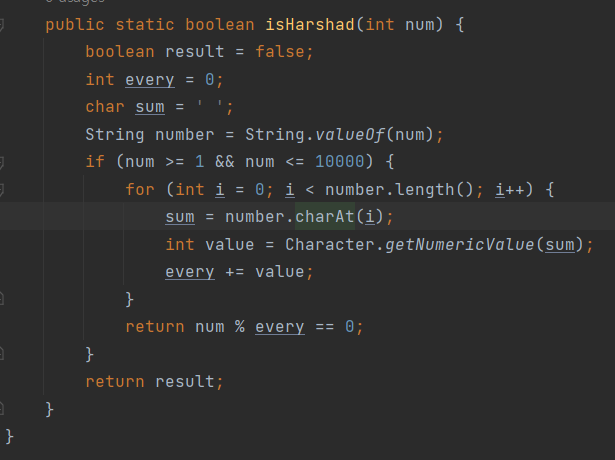- 총 개수는 main method에서 구해야 했기 때문에 main메서드에서 수를 세는 count변수를 지정, 그후 for문을 1에서 10000까지 돌리고 그 값에서 하샤드 수인것들만 count가 증감이 된다