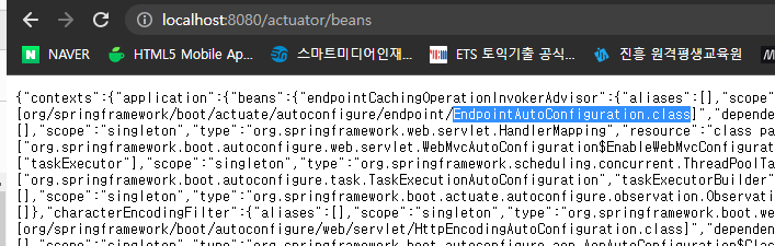 어플리케이션에 포함된 모든 스프링 빈을 beans엔드포인트를 확인할 수 있다.