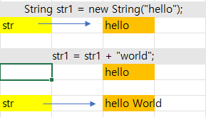 위의 그림처럼 새로운 String객체가 생성되고, 기존에 생성되었던 "hello"라는 데이터를 가진 객체는 Garbage가 되어 메모리만 잡아먹고 있을 뿐이다.