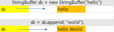 StringBuffer / StringBuilder의 경우 가변성의 성격을 가지는데, append(), delete()메서드를 이용해 하나의 객체 내에서 문자열을 변경할 수 있다.