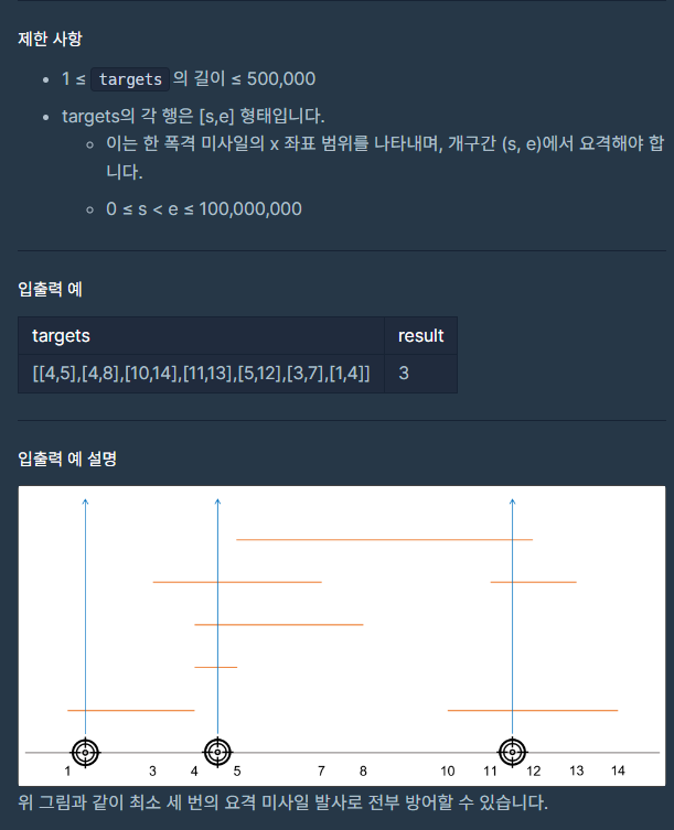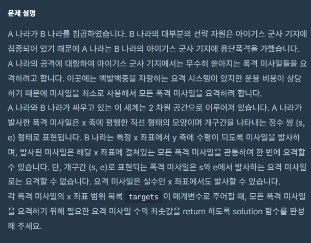 풀이 자체는 어렵지 않은 문제였으나, 실수인 x 좌표에서도 미사일을 발사할 수 있다는 문장 때문에 헷갈렸던 문제다.