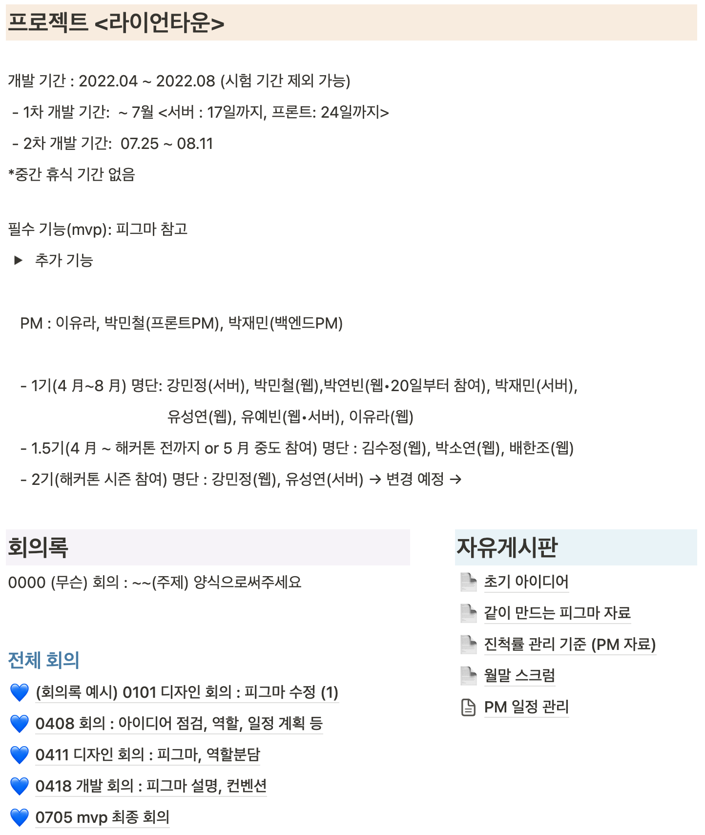 LionTown 역시 노션을 통해 회의록 및 공유가 필요한 내용들을 작성하면서 진행하였다.