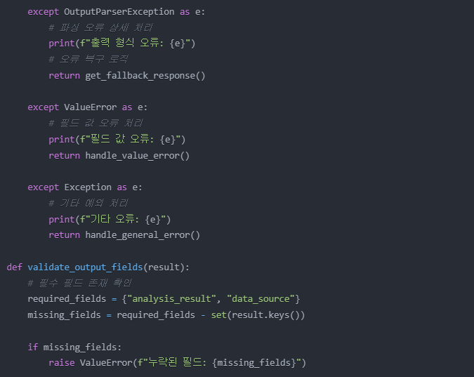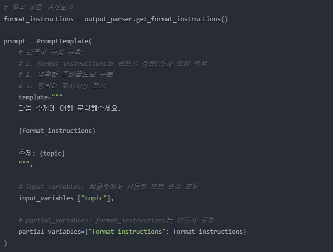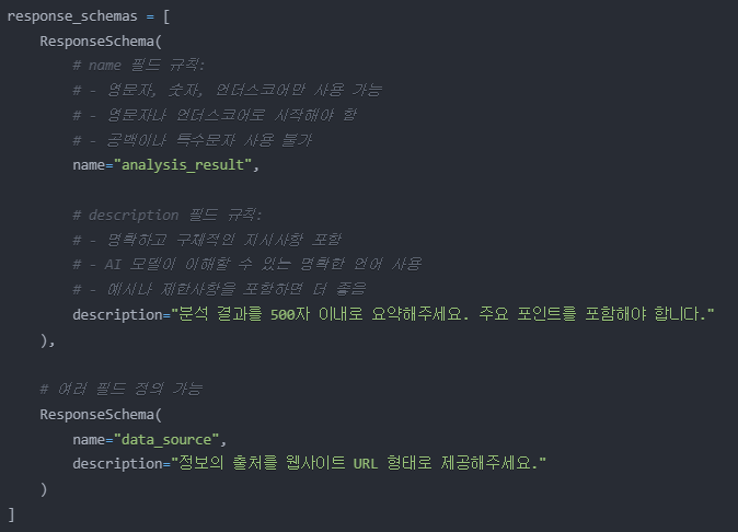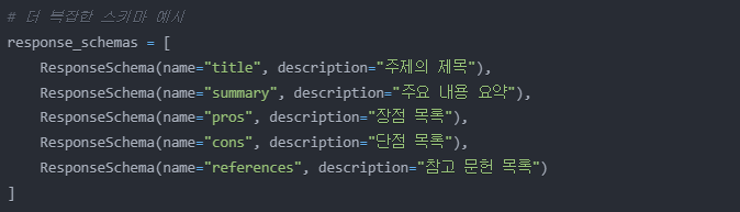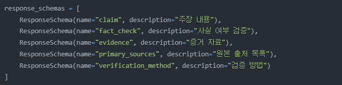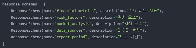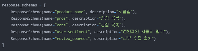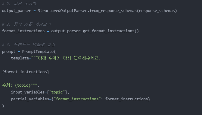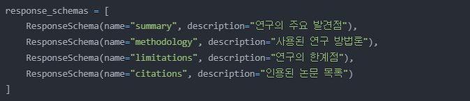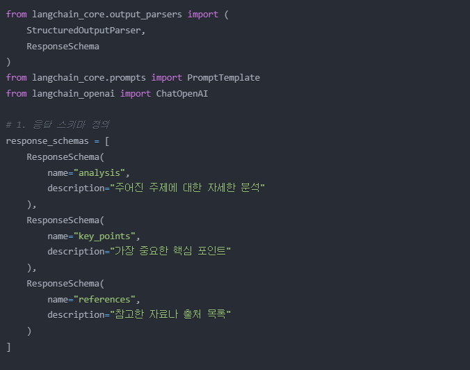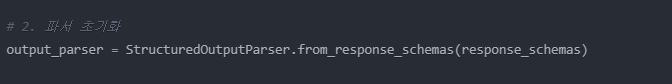 StructuredOutputParser를 response_schemas를 사용하여 초기화하여, 정의된 응답 스키마에 따라 출력을 구조화한다.