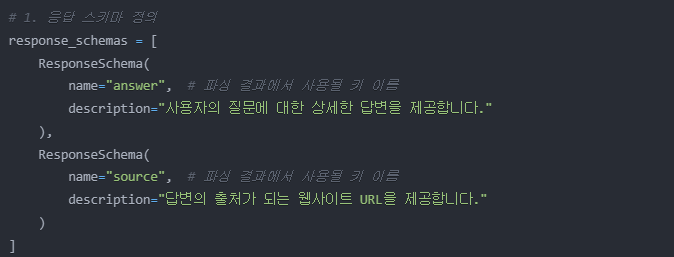 ResponseSchema 클래스를 사용해서 사용자의 질문에 대한 답변과 사용된 소스(웹사이트)에 대한 설명을 포함하는 응답 스키마를 정의한다.