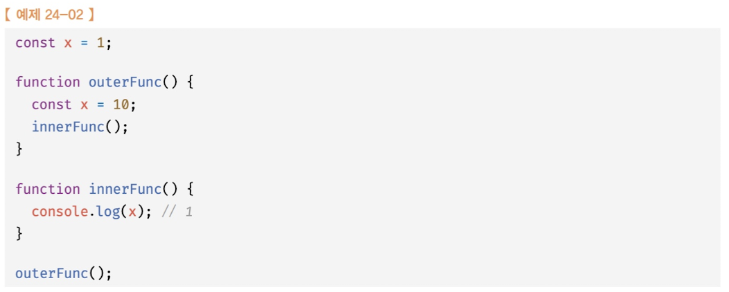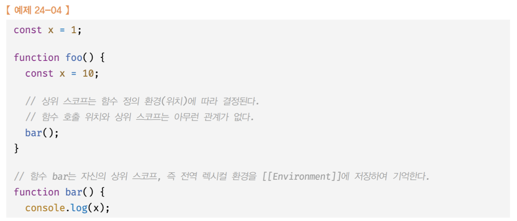 자바스크립트 엔진은 함수를 어디서 호출했는지가 아니라 함수를 어디에 정의했는지에 따라 상위 스코프를