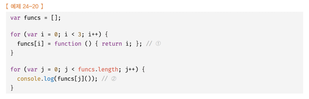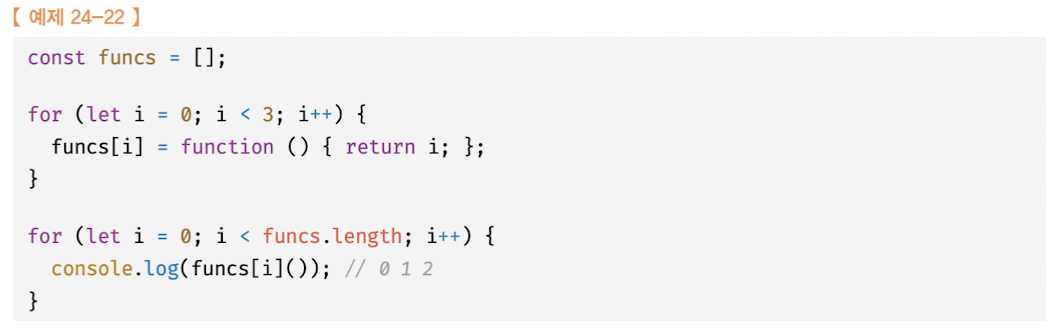 키워드를 사용하는 반복문(for문, for ... in 문, for ... of 문, while 문 등)은 코드 블록을 반복 실행할 때마다 새로운 렉시컬 환경을 생성하여 반복할 당시의 마지막 상태를 마치 스냅샷을 찍는 것 처럼 저장한다.