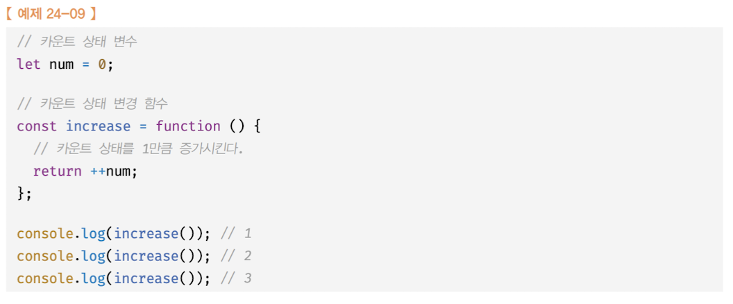 // 이 함수는 카운트 상태를 유지하기 위한 자유 변수 counter를 기억하는 클로저를 반환한다.