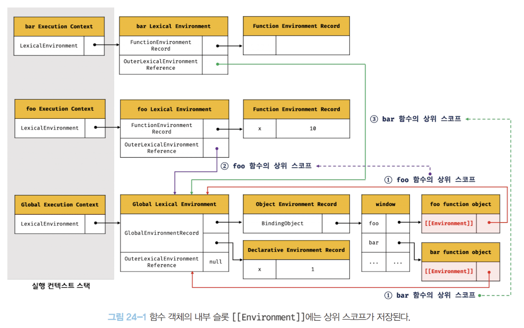 에 저장한 렉시컬 환경의 참조, 즉 상위 스코프를 자신이 존재하는 한 기억한다.위 예제의 foo 함수 내부에서 bar 함수가 호출되어 실행 중인 시점의 실행 컨텍스트는 다음과 같다.