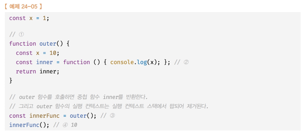 함수의 실행 컨텍스트는 실행 컨텍스트 스택에서 제거되지만 outer