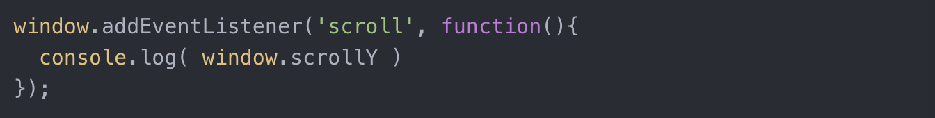window.scrollY 사용하면 현재 페이지를 얼마나 위에서 부터 스크롤했는지 px 단위로 알려준다.